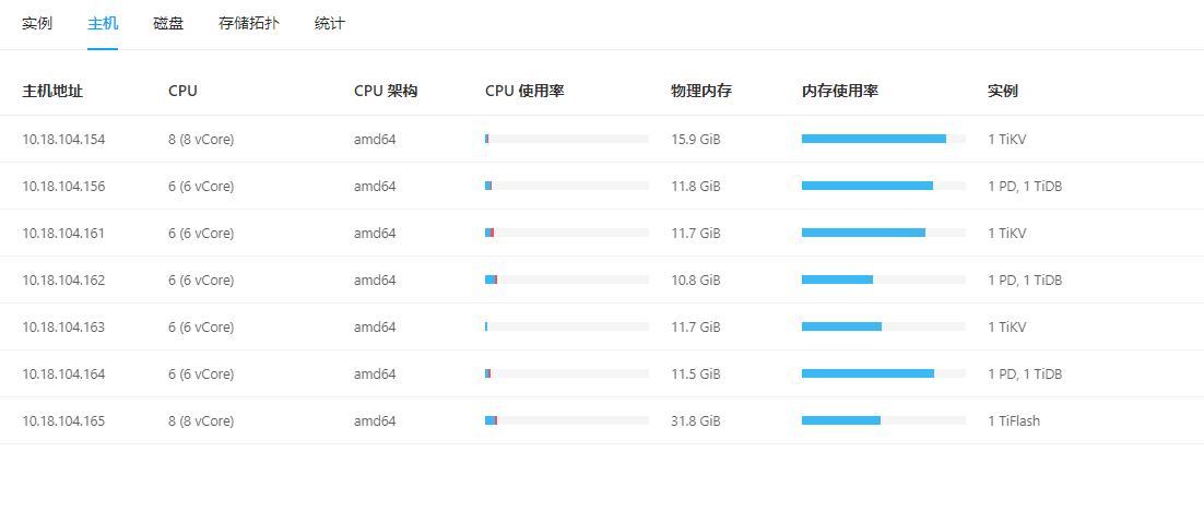 进入到 TiDB Dashboard -集群信息 (Cluster Info) -主机(Hosts) 截图此页面