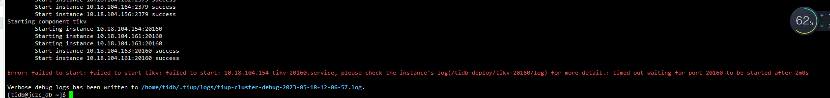 Error: failed to start tidb: failed to start: 10.18.104.164 tidb-4000.service, please check the instance's log(/tidb-deploy/tidb-4000/log) for more detail.: timed out waiting for port 4000 to be started after 2m0s