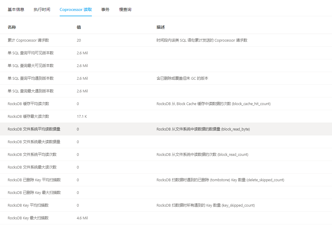 | │ └─Selection_29 | cop[tikv] | 8332 | eq(shihua_center.black_info_new.exist_or_not, 0) | 8332 | tikv_task:{proc max:84ms, min:0s, avg: 26.2ms, p80:38ms, p95:84ms, iters:34, tasks:6}, scan_detail: {total_process_keys: 480, total_process_keys_size: 84068, total_keys: 481, get_snapshot_time: 78.7µs, rocksdb: {key_skipped_count: 480, block: {cache_hit_count: 11}}} | N/A | N/A | |