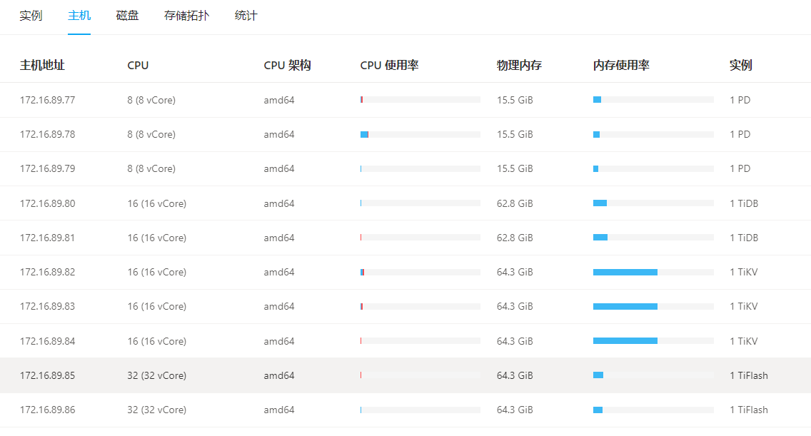 【资源配置】进入到 TiDB Dashboard -集群信息 (Cluster Info) -主机(Hosts) 截图此页面