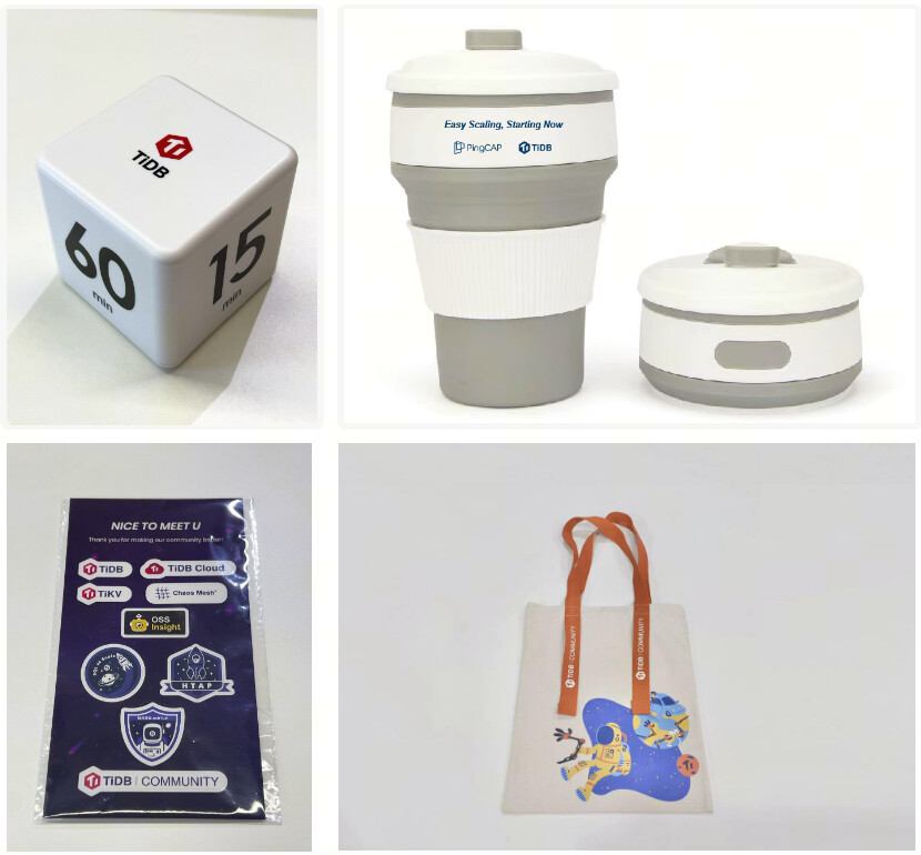 - 初赛评审通过的 60 支队伍皆可获得 限量定制款 TiDB hackathon 礼包(收到过往届礼物的小伙伴们,每一届的新周边,都有新惊喜!)