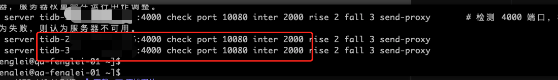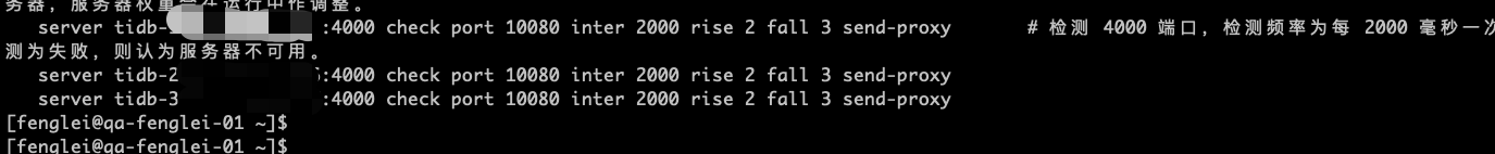 server tidb-192.168.1.217:4000 192.168.1.237:4000 check port 10080 send-proxy inter 2000 rise 2 fall 3