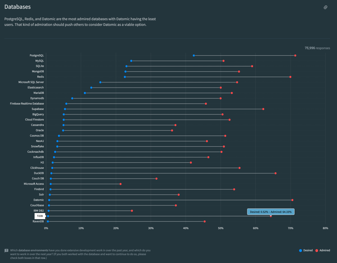 在 2023 年 5 月 Stackoverflow 发布的超过 9 万名全球开发人员参与的 2023 年度调查中,TiDB 成为在数据库相关调查中被提及的唯一一家来自中国的数据库。