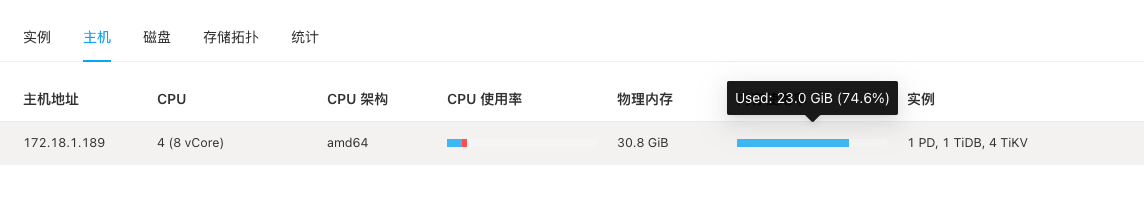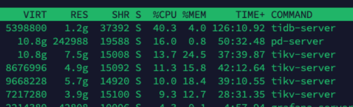 额,你这1PD,1TIDB,4tikv合用30G内存,啥也不跑,光系统进程站的内存也得占个20G了吧。。。。