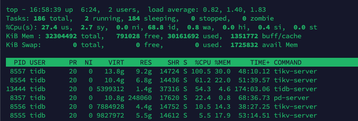 tikv是时刻需要干活的,占用内存多正常,你如果混合部署的话,把storage.block-cache.capacity的值都调整的小一点,你现在1个30G内存的机器,跑了1个PD,1个tidb,4个TIKV,每个tikv的storage.block-cache.capacity大概调整为总内存的1/645%,也就是30/60.45=2.25G,就行