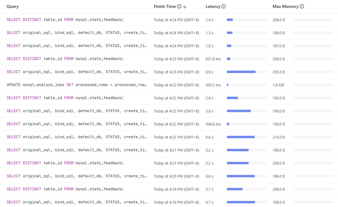 SHOW ANALYZE STATUS看下是不是在收集统计信息,可以把对应3个大表的自动收集统计信息任务暂停