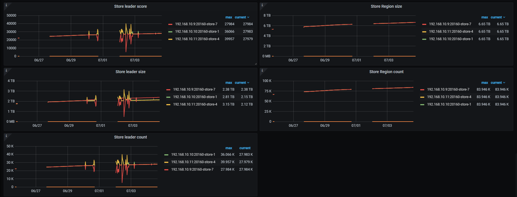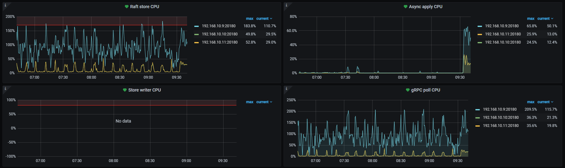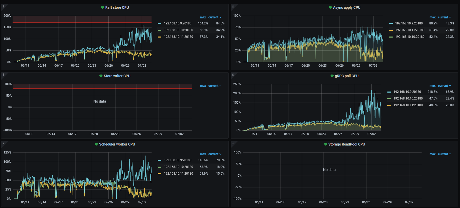 a. 三个TiKV结点中有一个的各项CPU指标都很高,从项目启动开始即这样。6月26日这一现象被放大了数倍。