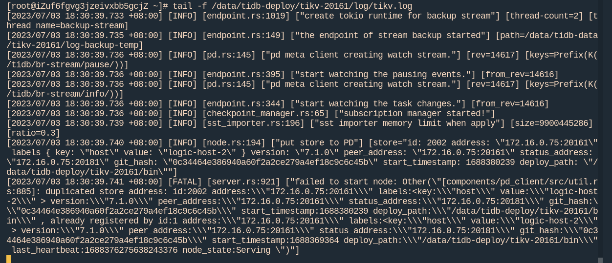 我有三个tikv节点(单机部署),删除了2个tikv的磁盘数据,然后根据 【SOP 系列 18】TiUP 环境恢复 TiKV 副本 去尝试修集群,在链接中的 7. 重启集群,这时候丢失的 data 目录会自动补数据,但是 tikv 日志会报重复 store 的错误,之后我停掉正常的tikv节点后, 执行store delete <store_id> 出现错误,无法删除,报错信息请见下面的截图