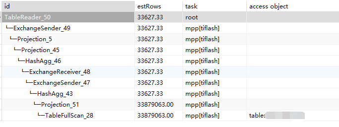 tiflash mpp执行计划如上,3000w数据聚合3w条,也就5.5s左右出结果。