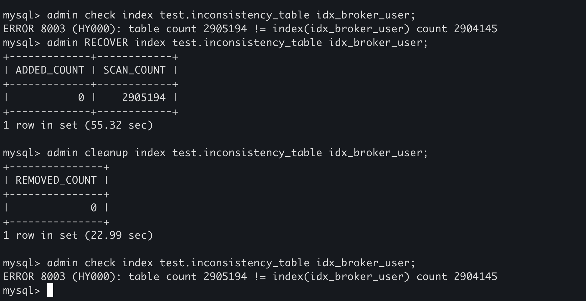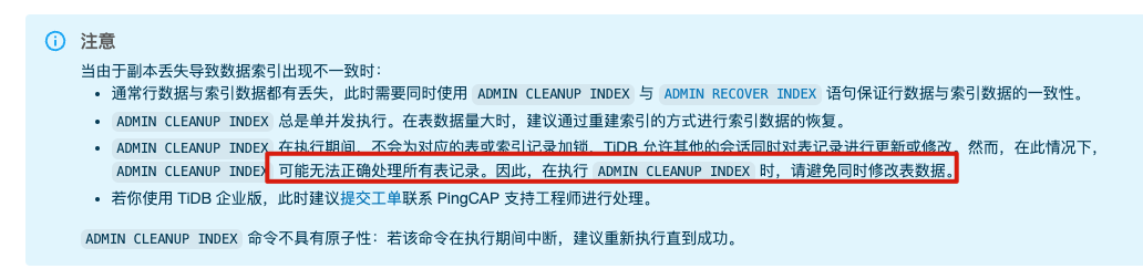 看到有两个命令ADMIN CLEANUP INDEX和ADMIN RECOVER INDEX来修复索引数据的,不知道有什么坑不?