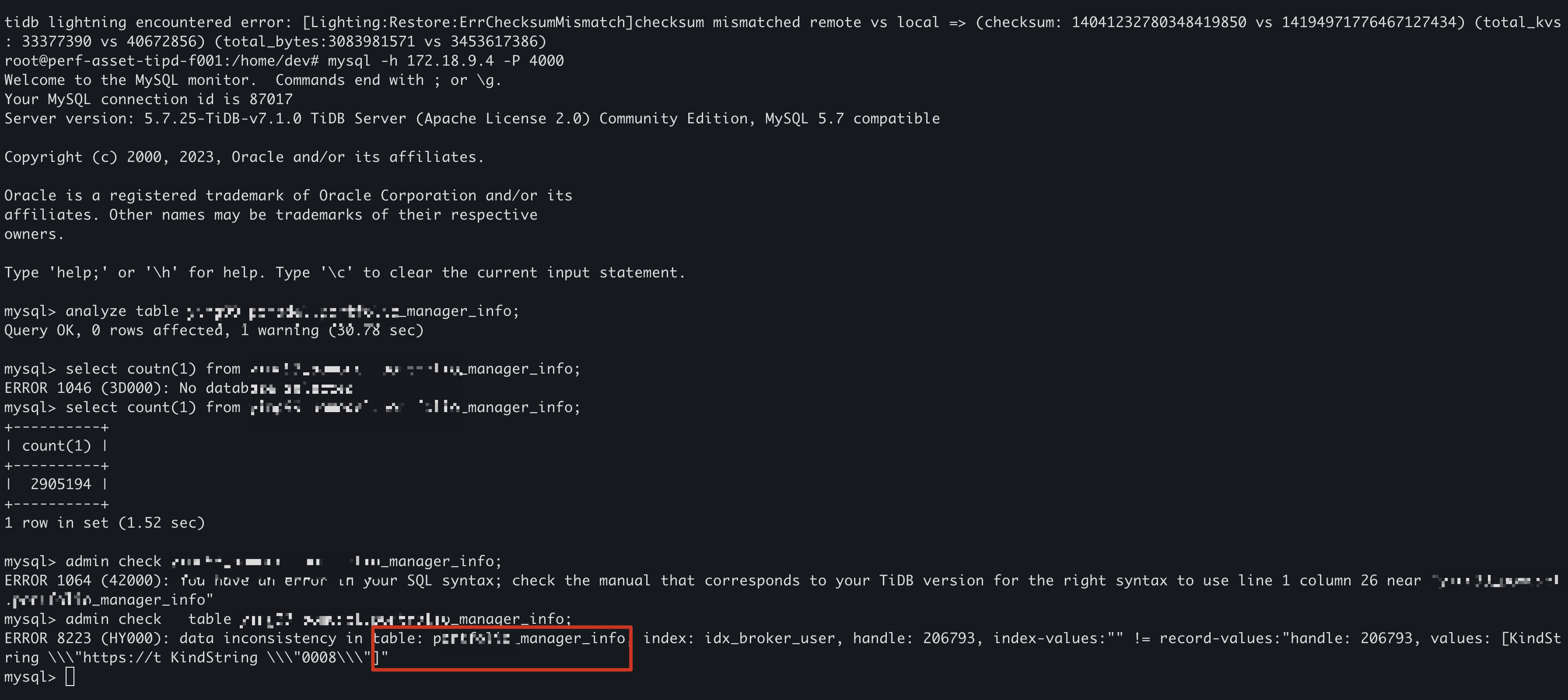 还有多次 lightning 重复导入,是使用了断点么?导入之后有没有用过 admin check table 检查呢, sync-diff 是不能检查出数据索引不一致的