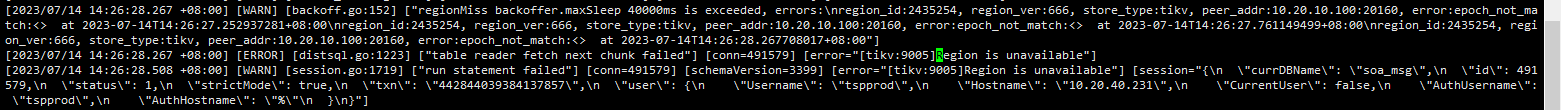 这个报错不代表region一定有问题,有时候tikv忙碌,tikv oom,或者tidb与tikv之间的网络有问题等都有可能出现这个报错, TiDB 内部会进行 backoff 重试,只要在一定时间内,报错不是太多,不影响数据库使用,如果产生告警了,就代表过去一段时间这种报错超过阈值了,建议从下面几个方面核查