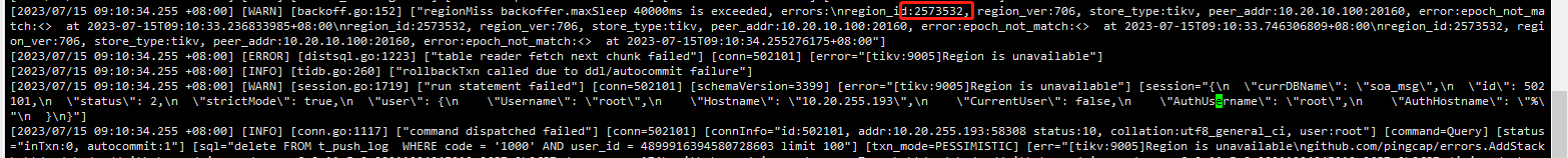 你看下tidb的日志里有region id信息吗,然对着region id 去tikv 日志里找找相关信息