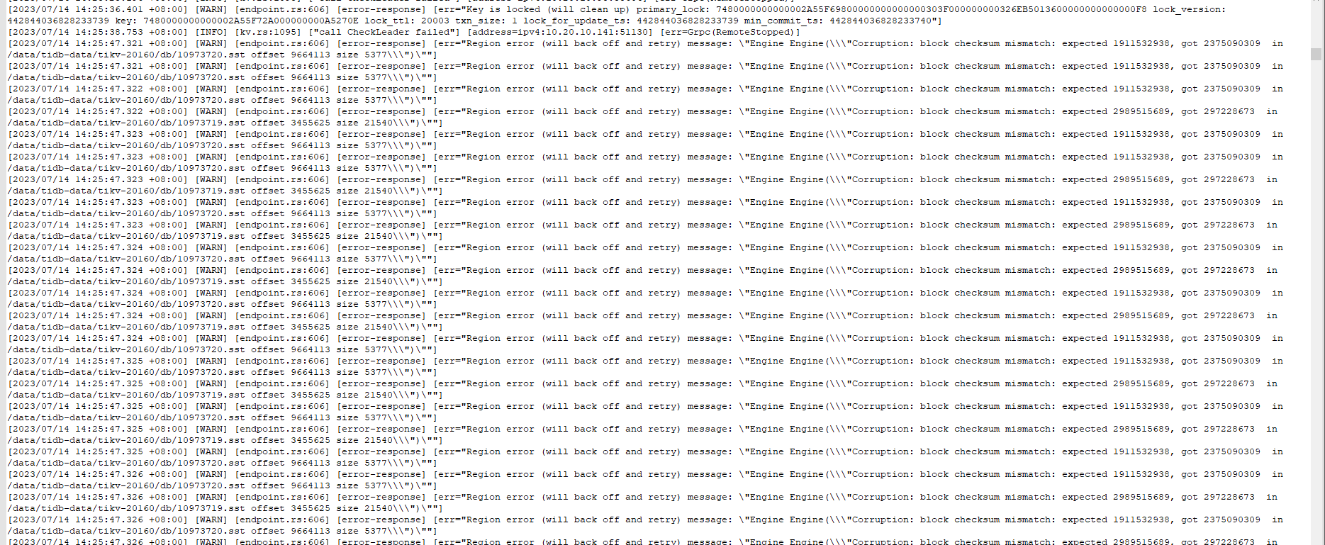 我看tikv日志后面也有block checksum mismatch这个报错 ,也没找到2435254 region的信息。你看tidb的日志后面有报reion unavaliable没,时间是否和tikv的日志对的上。 tikv有检查bad sst文件的命令,不过需要停止tikv: