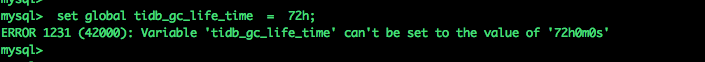 mysql> update mysql.tidb set VARIABLE_VALUE='72h' where VARIABLE_NAME='tikv_gc_life_time';