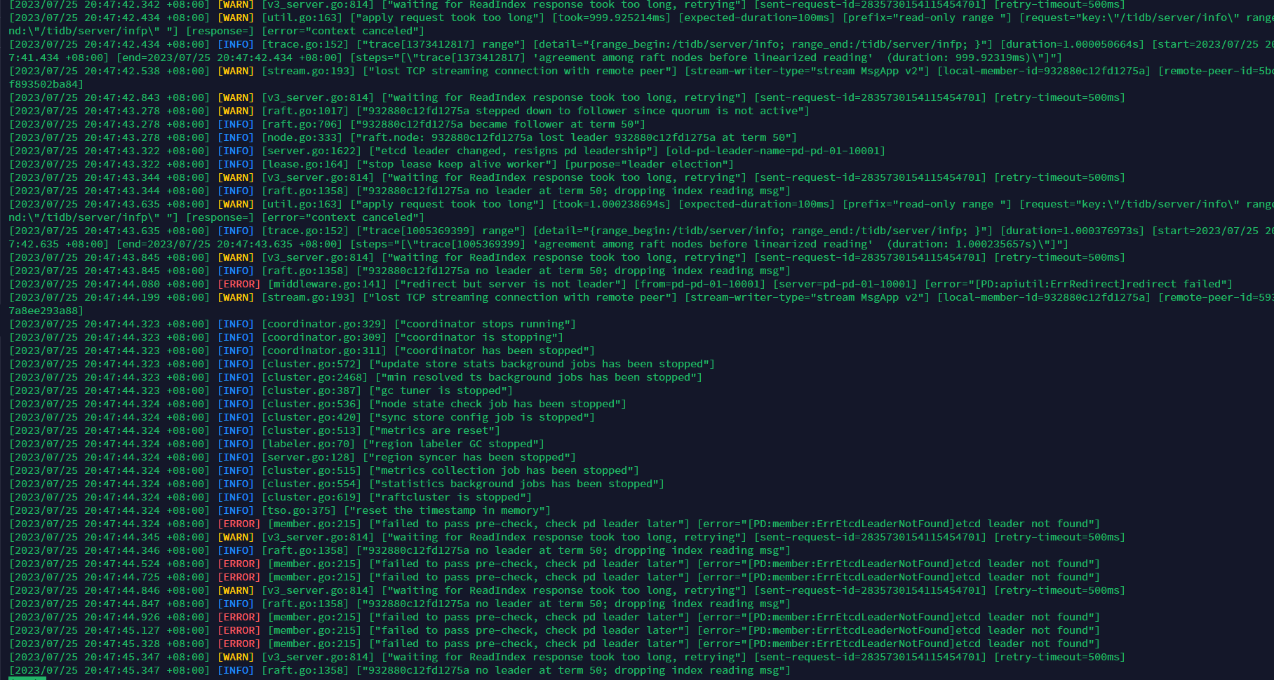 pd-03:10001 pd pd-03 10001/10002 linux/x86_64 Down /zol/tidb-data/pd-2379 /zol/tidb-deploy/pd-2379
