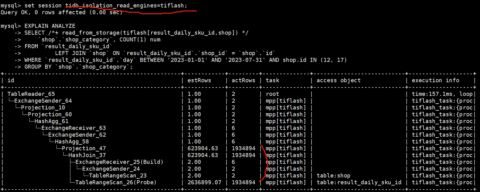 | └─ExchangeSender_35 | 0.62 | 0 | mpp[tiflash] | | tiflash_task:{time:17.3ms, loops:0, threads:8} | ExchangeType: HashPartition, Compression: FAST, Hash Cols: [name: test.shop.shop_category, collate: utf8mb4_general_ci], stream_count: 4 | N/A | N/A |
