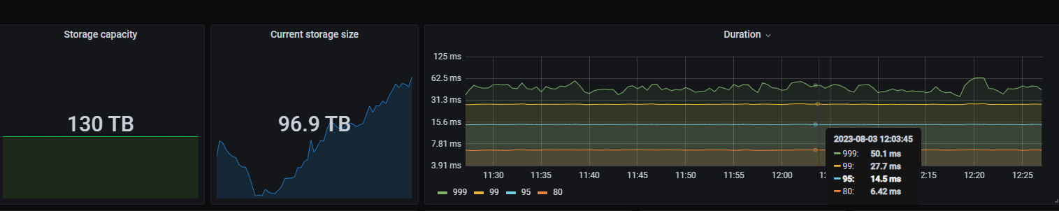 我们有数据量千亿左右的单表,做了3机房容灾,qps2万多P99100ms以内,也有集群数据量接近200TB的,qps1W以内P99不到30ms。