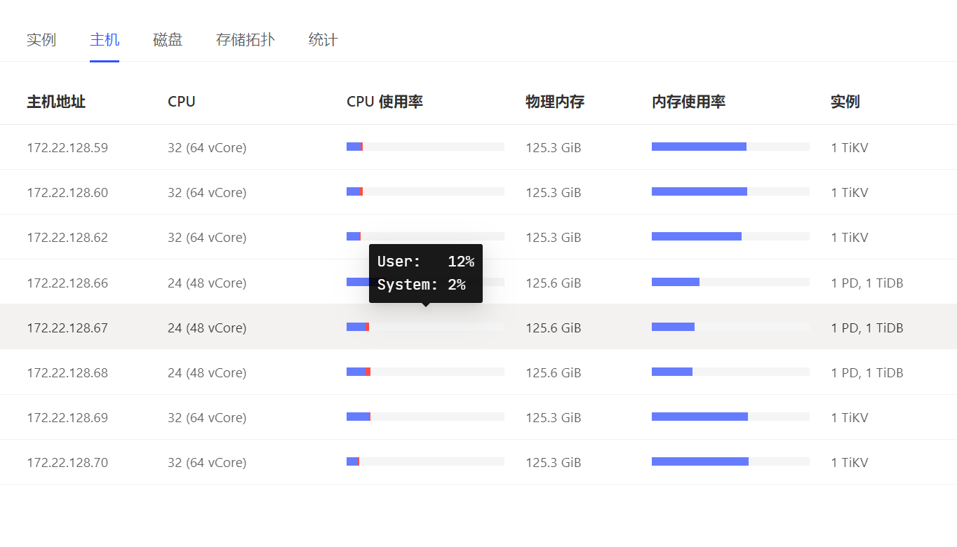 【资源配置】进入到 TiDB Dashboard -集群信息 (Cluster Info) -主机(Hosts) 截图此页面