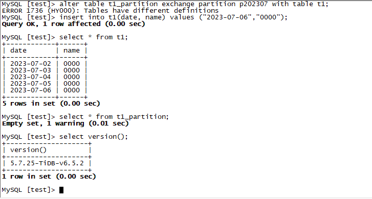 背景: 希望通过exchange partition的操作,将一个非分区表改造成分区表,但是在操作时候,发现exchange partition操作会报失败,同时会影响非分区表的写入。报错内容是ERROR 1736 (HY000): Tables have different definitions,之后往非分区表插入超过对应分区定义的数据时候,就会报错ERROR 1748 (HY000): Found a row not matching the given partition set。