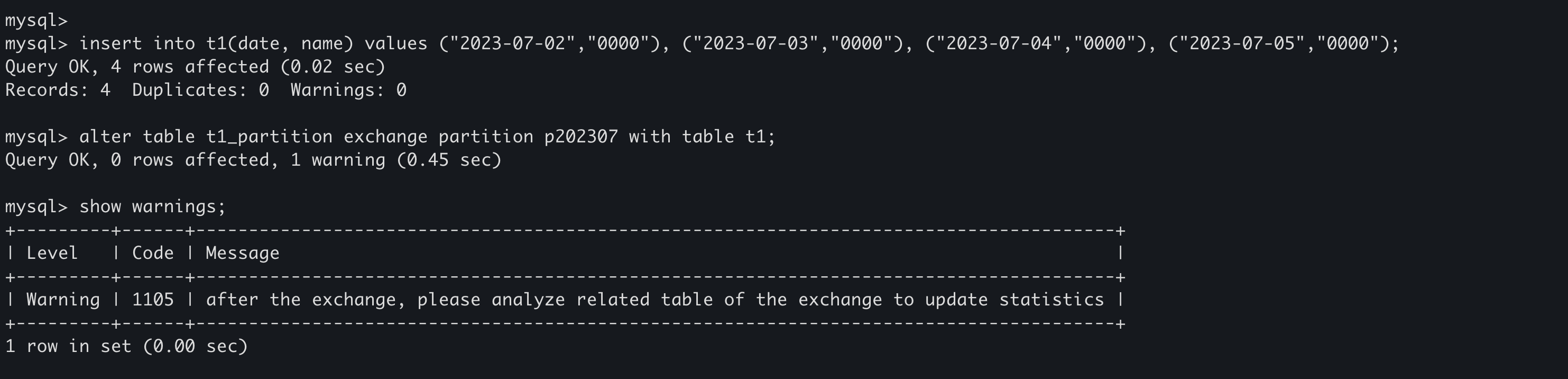 mysql> alter table t1_partition exchange partition p202307 with table t1;