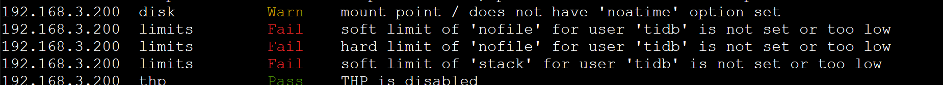 192.168.3.201 limits Fail soft limit of 'nofile' for user 'tidb' is not set or too low