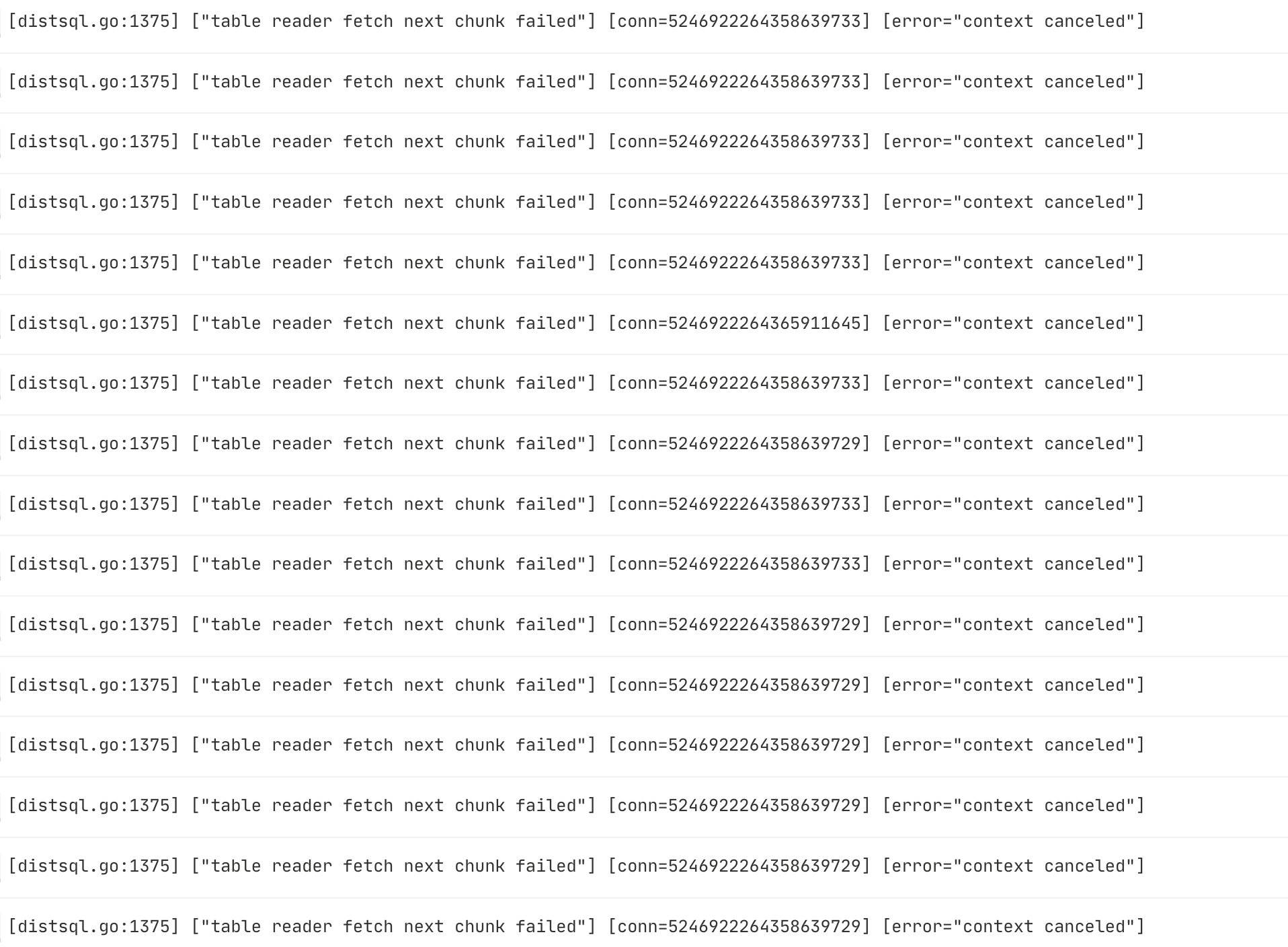 [distsql.go:1375] ["table reader fetch next chunk failed"] [conn=5246922264358639729] [error="context canceled"]