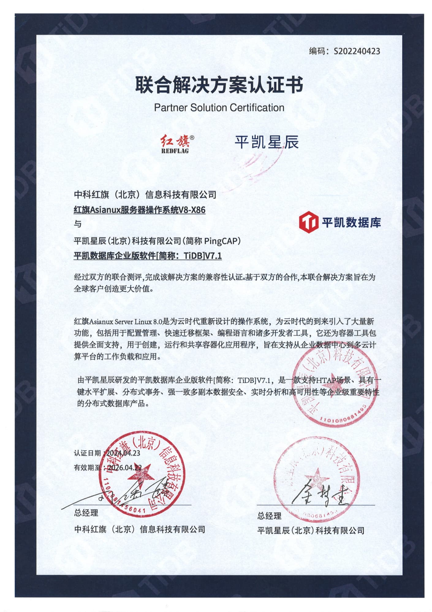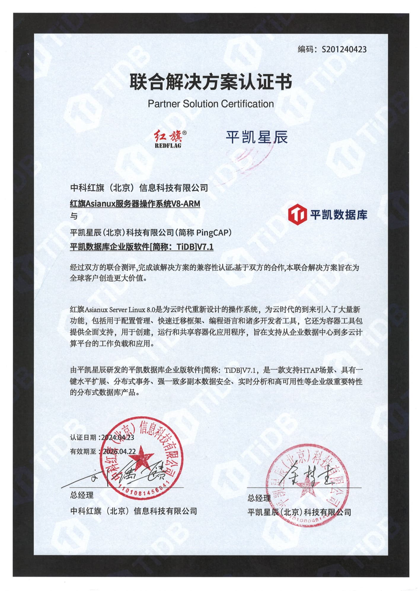 1. 红旗 Asianux 服务器操作系统 V8-X86 与 TiDB V7.1 完成联合解决方案认证