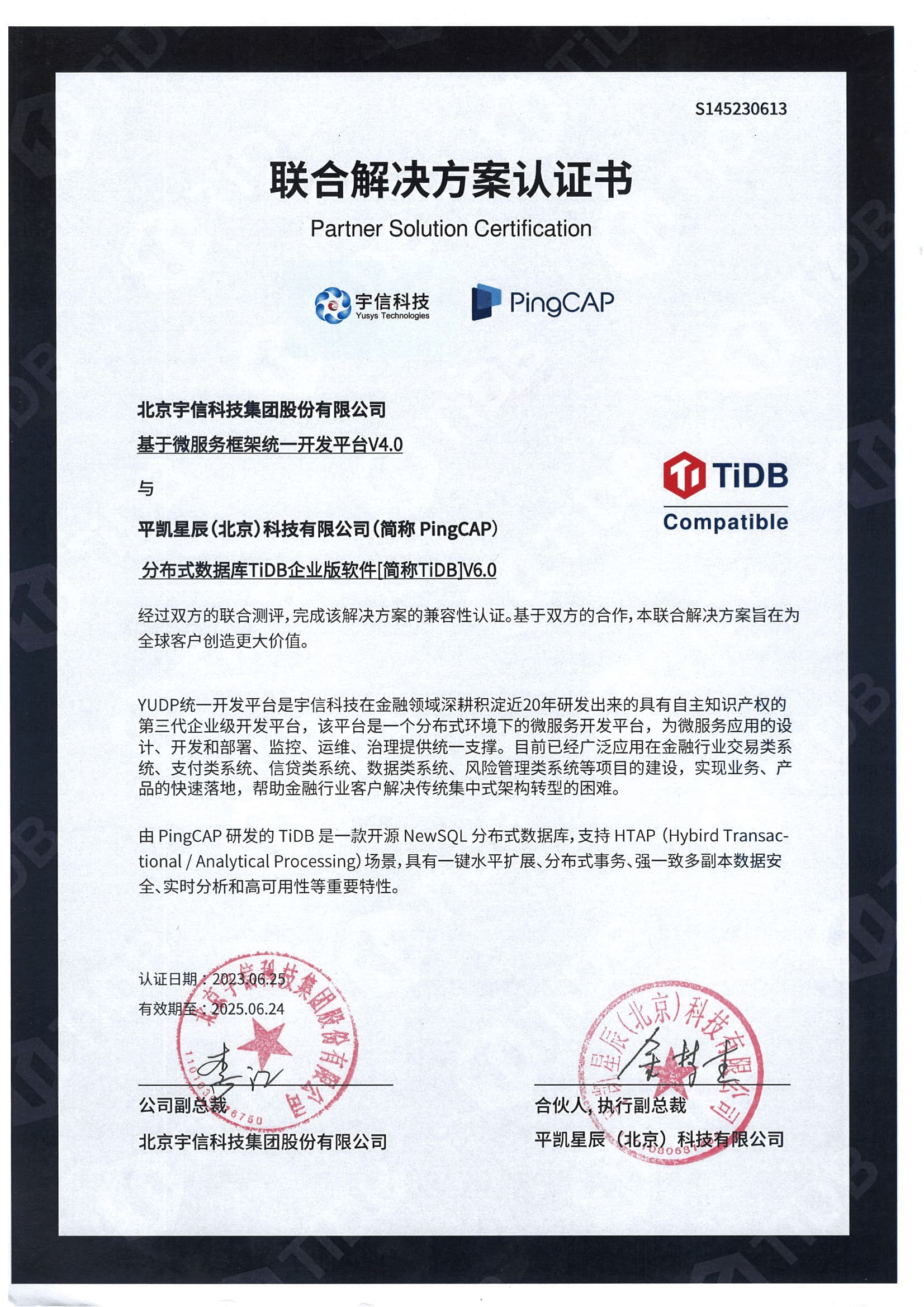 23. 宇信科技 信贷研发中台软件 与 TiDB 完成解决方案兼容性认证