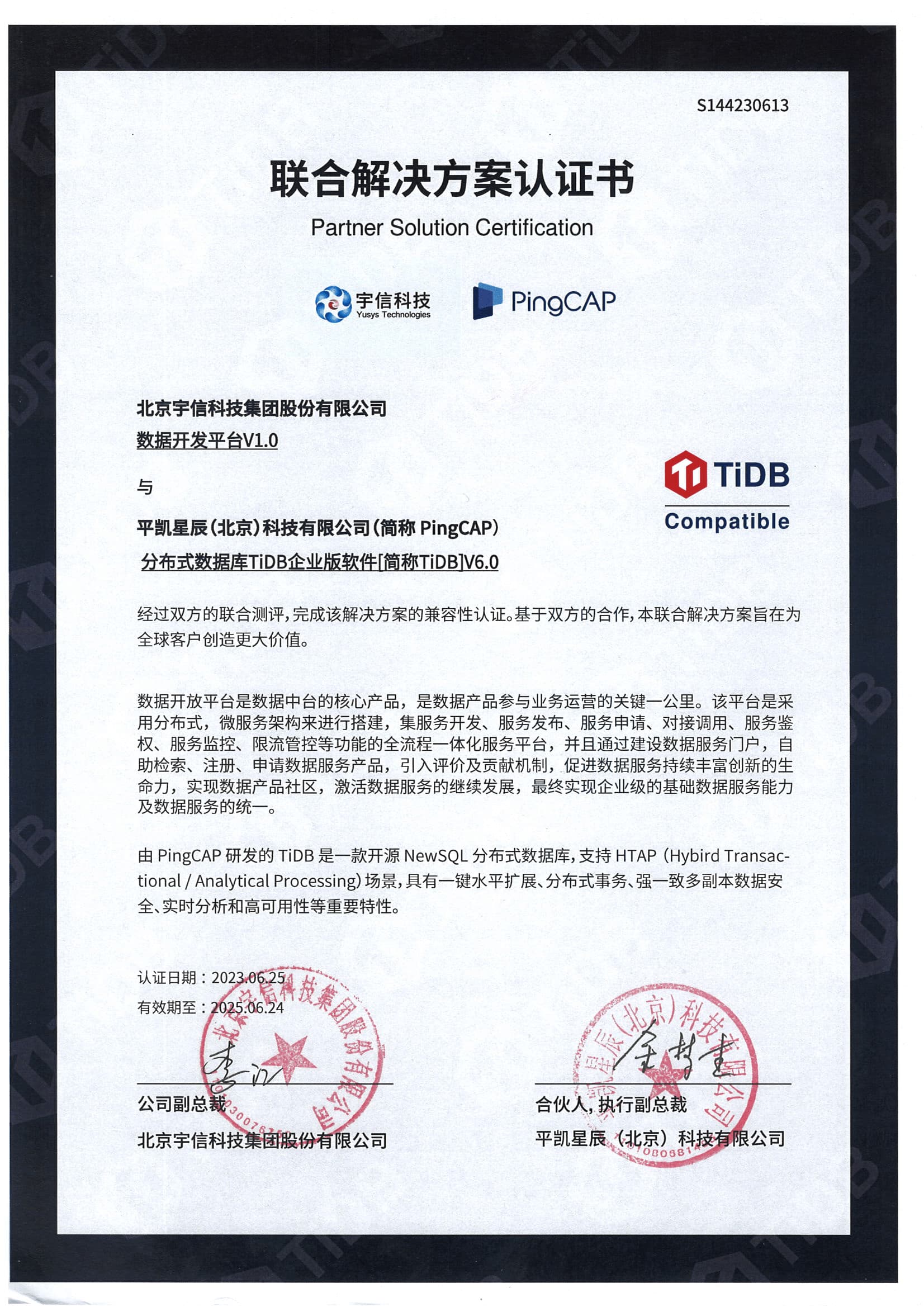 25. 宇信科技 数据开发平台 与 TiDB 完成解决方案兼容性认证