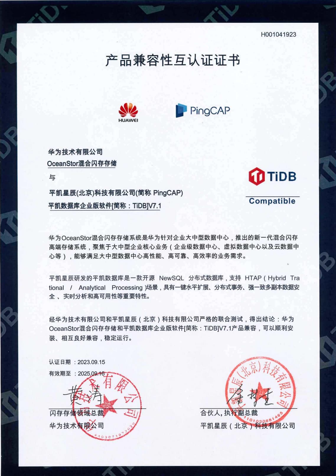 1. 华为 OceanStor Dorado 全闪存存储 与 TiDB V7.1 完成产品兼容性认证