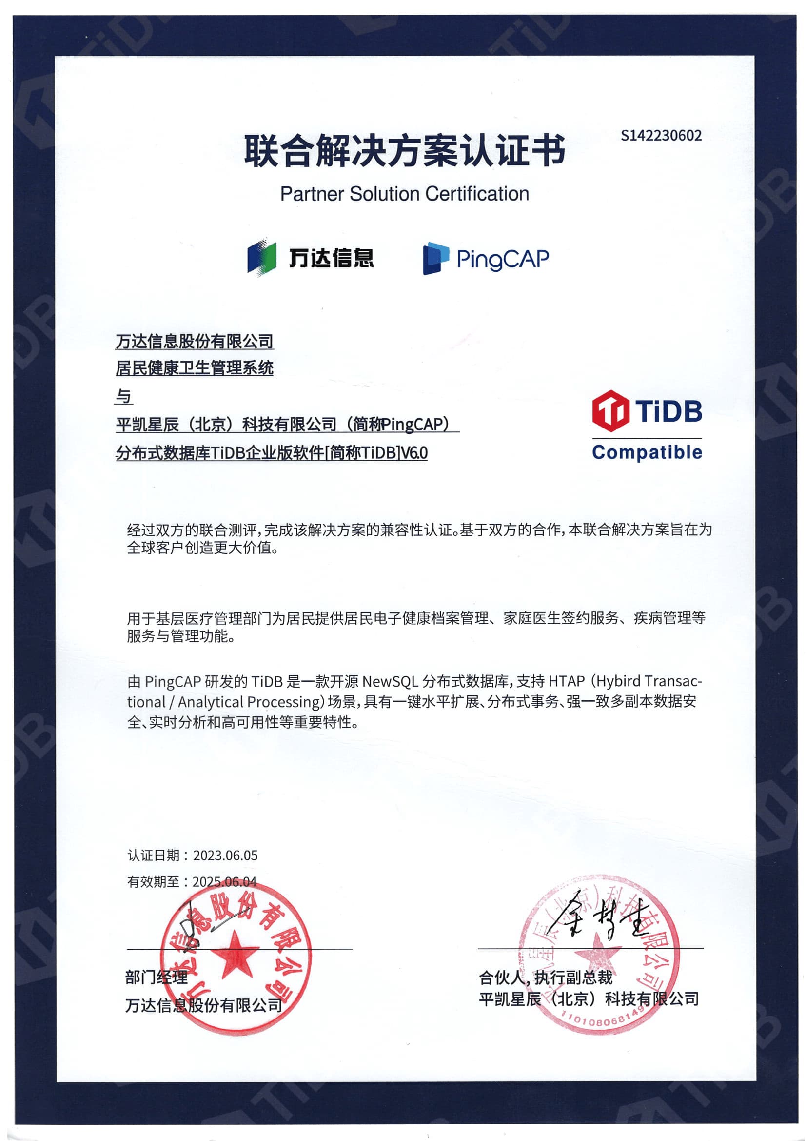 27. 万达信息 基层医疗卫生信息系统一体化 与 TiDB 完成产品兼容性认证