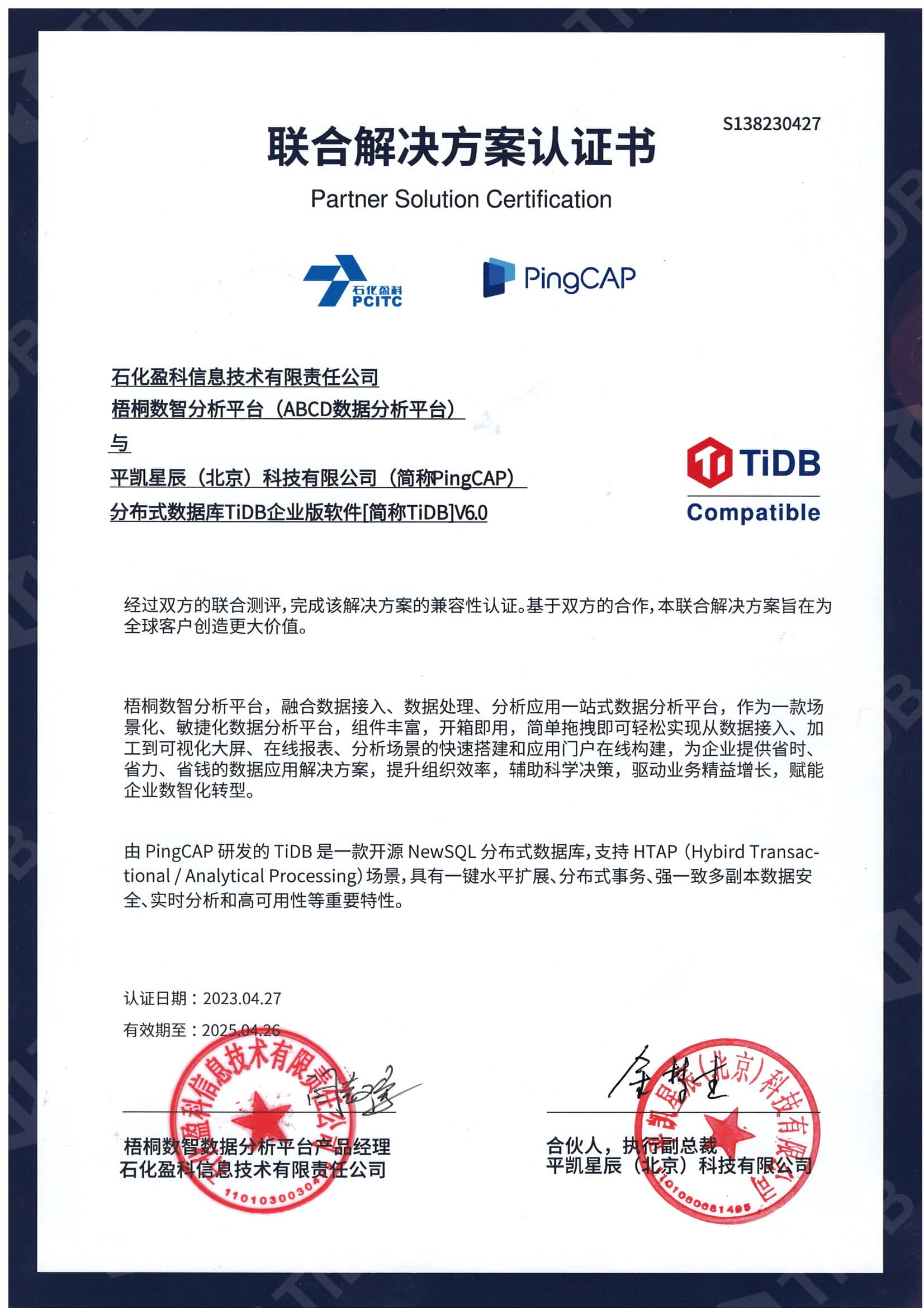 30. 石化盈科 梧桐数智分析平台 与 TiDB 完成解决方案兼容性认证