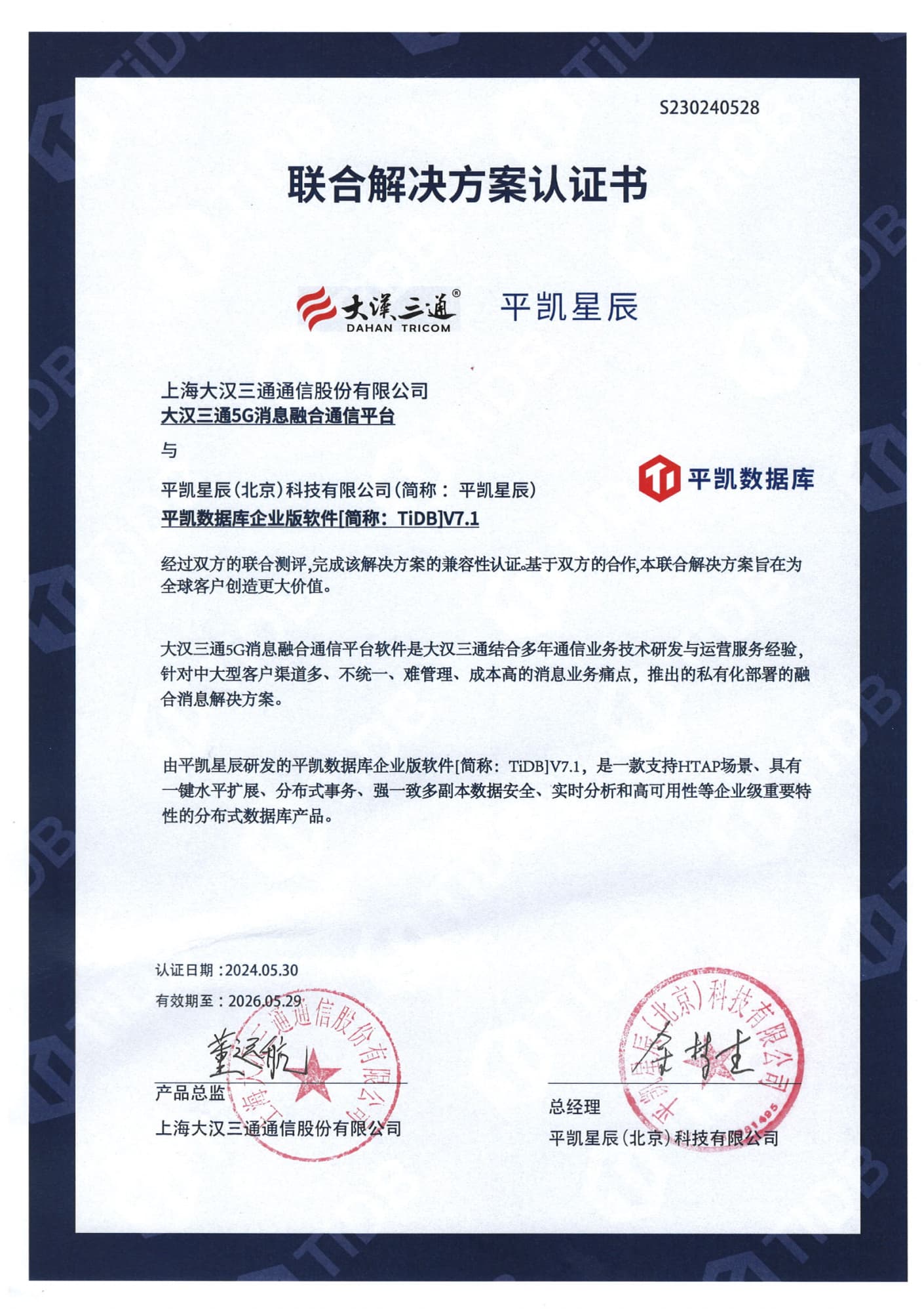 3. 大汉三通5G消息融合通信平台与 TiDB V7.1 完成联合解决方案认证