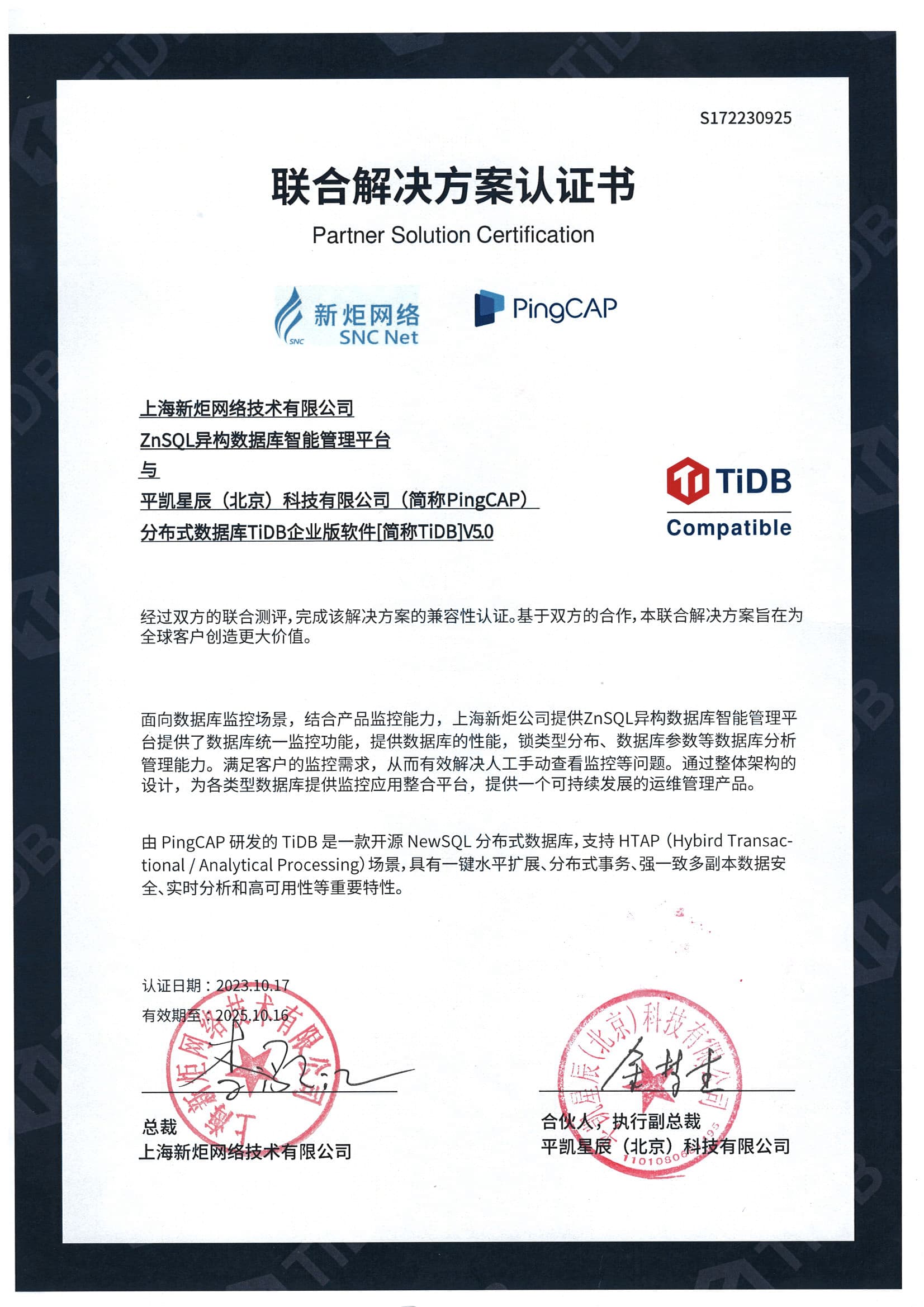15. 新炬网络 ZnSQL 异构数据库智能管理平台 与 TiDB 完成解决方案兼容性认证