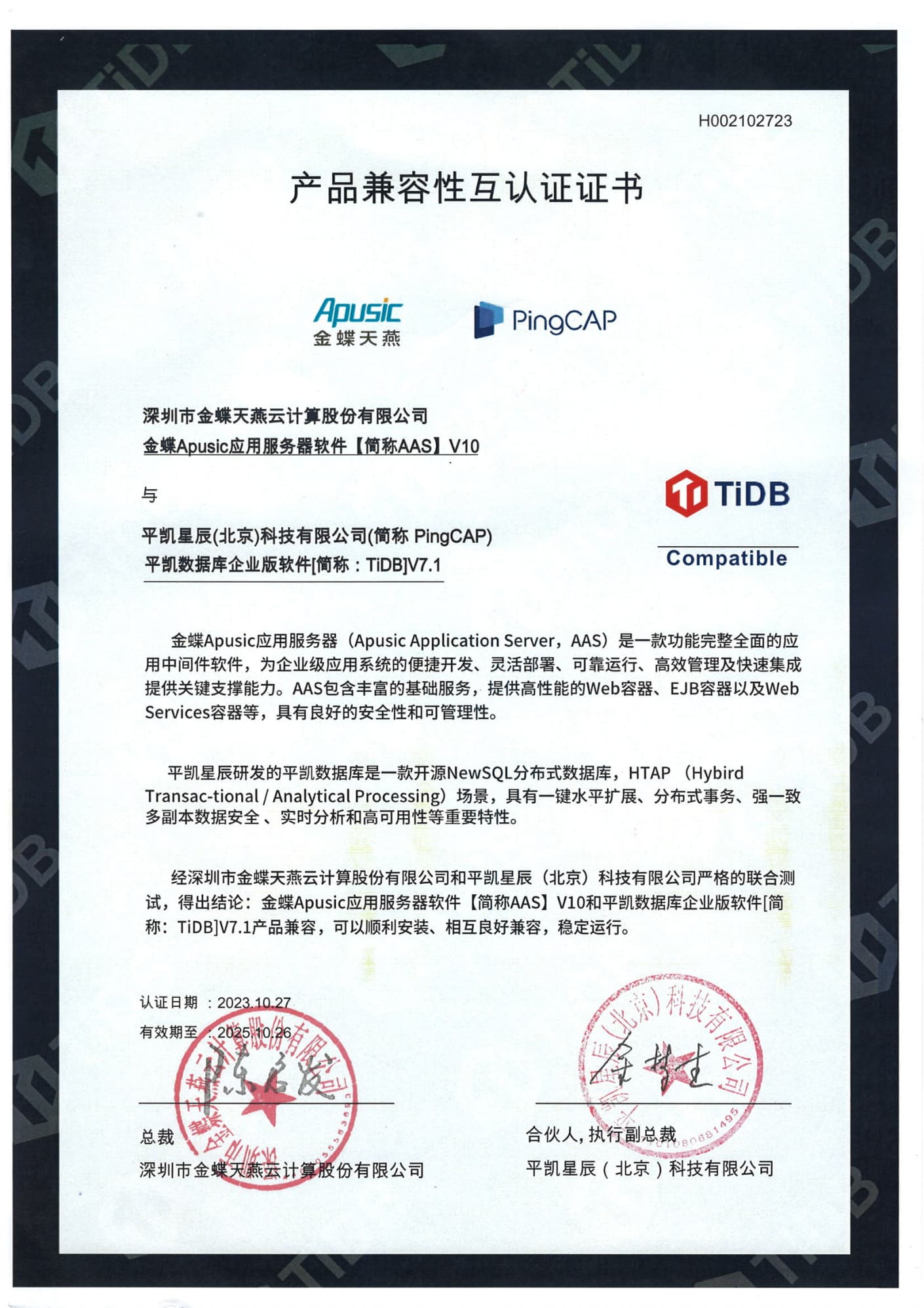 3. 金蝶Apusic应用服务器软件【简称AAS】V10 与 TiDB V7.1 完成产品兼容性互认证