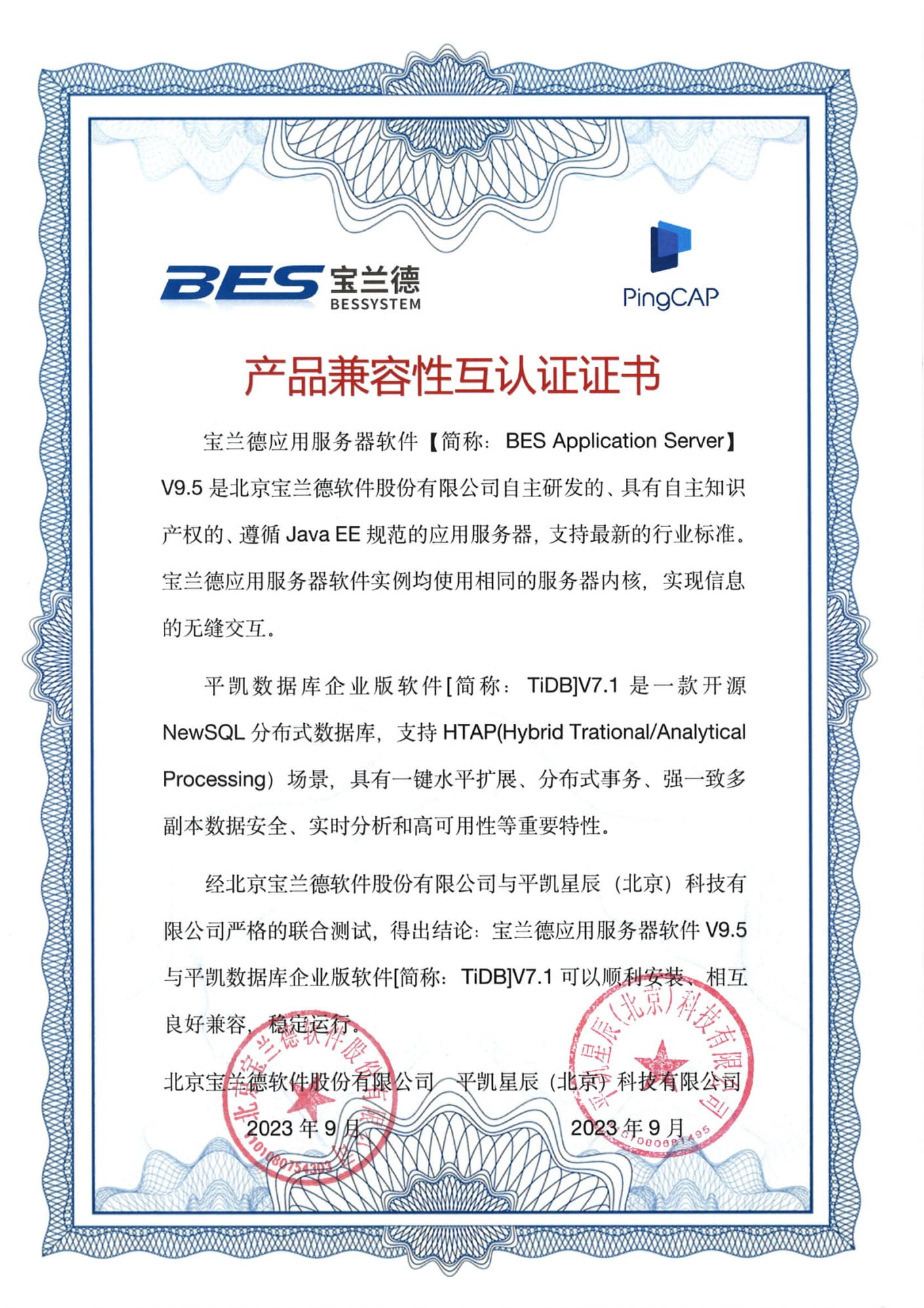 10. 宝兰德应用服务器软件[简称:BES Application Server]V9.5 与 TiDB V7.1 完成产品兼容性互认证