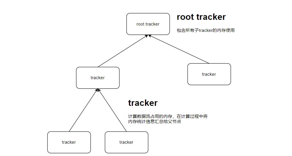 内存追踪的最小单元是一个tracker,将其插入到语句执行的各个阶段,根据语句->算子->算子内数据处理形成树形层次,每一次数据处理产生的内存使用都会统计到tracker中,并把内存使用情况累加到parent tracker中,最终汇总到root tracker,因此就形成了一颗内存追踪树。