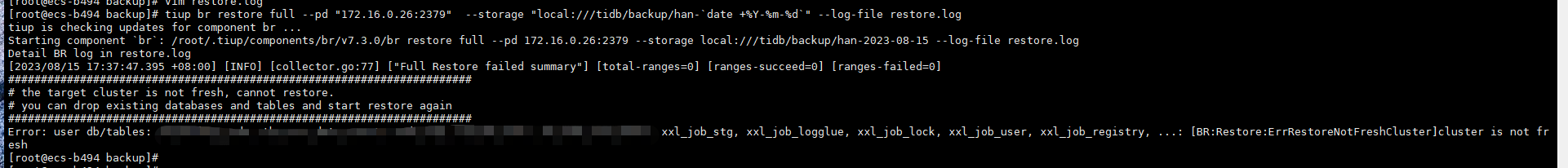 步骤:新建了3个数据库名字为 han_xxxx格式,每个库中建了一个表插入了一条数据。使用br backup full进行备份,恢复的时候报错[BR:Restore:ErrRestoreNotFreshCluster]cluster is not fresh
