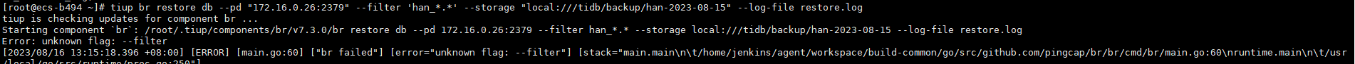 tiup br restore full --pd “xxx:2379” --filter ‘han*.*’ --storage “local:///tidb/backup/test-date +%Y-%m-%d” --log-file restore.log