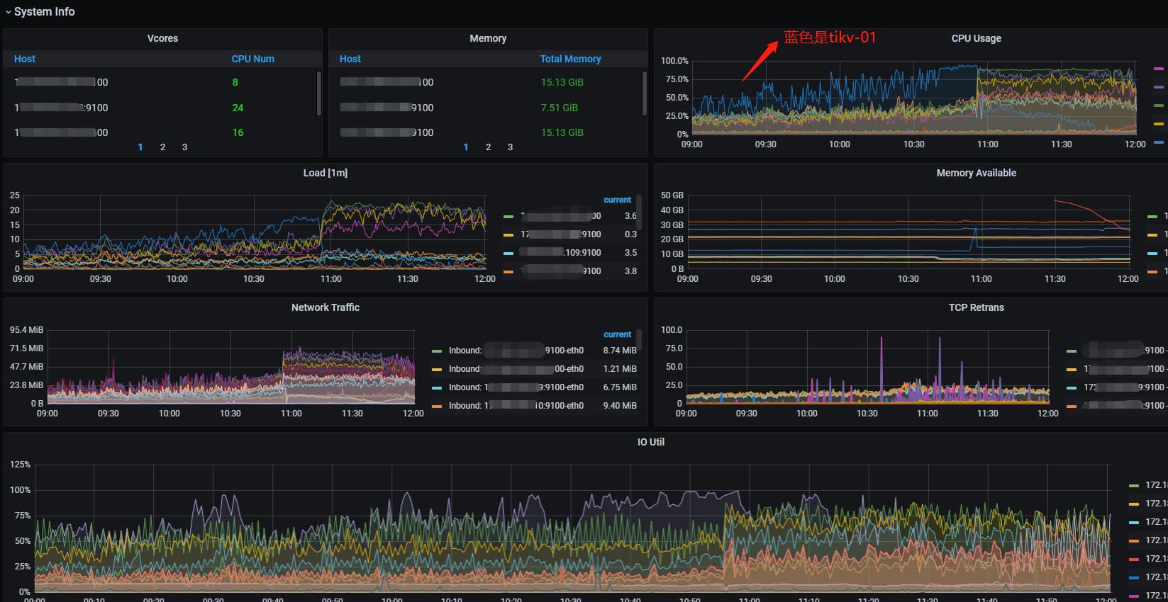 今天早上10点40业务高峰遇到16核的tikv-01节点负载奇高,系统出现延迟,大量8秒以上的慢查询。查看执行计划,几乎都是最长处理时间实例tikv-01节点。