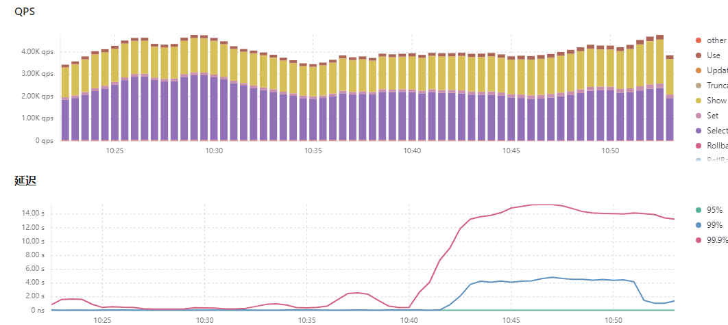 在10点45分执行缩容tikv-01,结果就出现雪崩。业务卡顿长达一小时。直至tikv-01的region降到0才有所缓和。