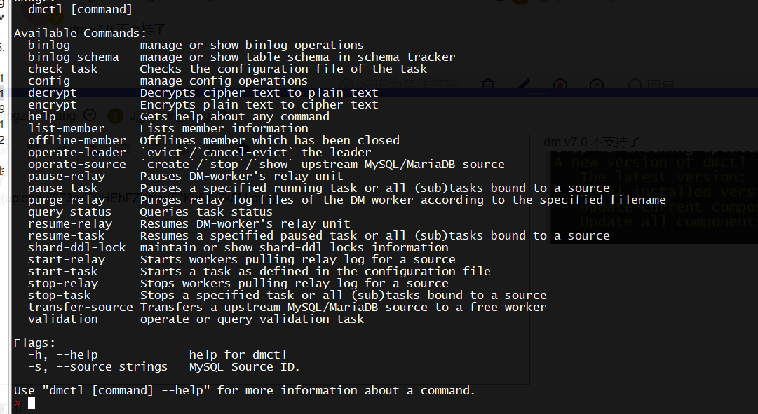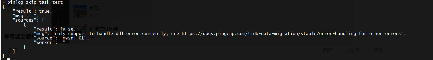binlog 命令管理和查看 binlog 操作。命令仅在 DM v6.0 及其以后版本支持,之前版本可使用 handle-error 命令。