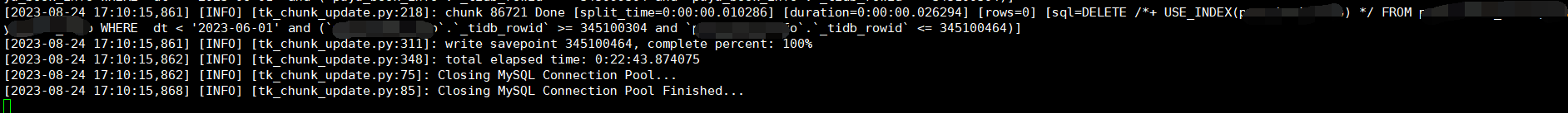 [2023-08-23 16:57:11,390] [INFO] [tk_chunk_update.py:215]: chunk 131498 Done [split_time=0:00:00.013967] [duration=0:00:40.087776] [rows=1000] [sql=DELETE FROM db.t WHERE dt < '2023-06-01' and (`t`.`_tidb_rowid` >= 252175339 and `t`.`_tidb_rowid` < 252176339)]