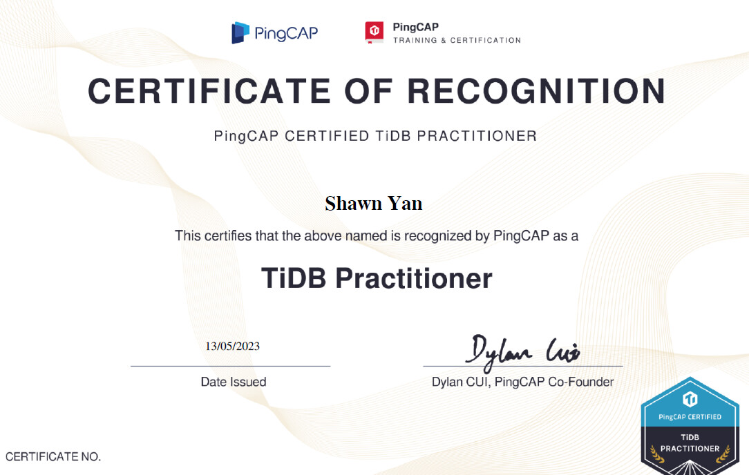 ● 考试通过即可获得 PingCAP 颁发的 TiDB 从业者认证证书,为您的技能背书。