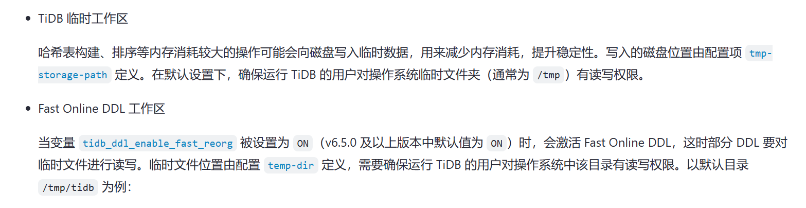 6.5以后加索引tidb节点也会有临时磁盘占用。 当内存使用超出 mem-quota-query限制时某些算子也会用临时磁盘