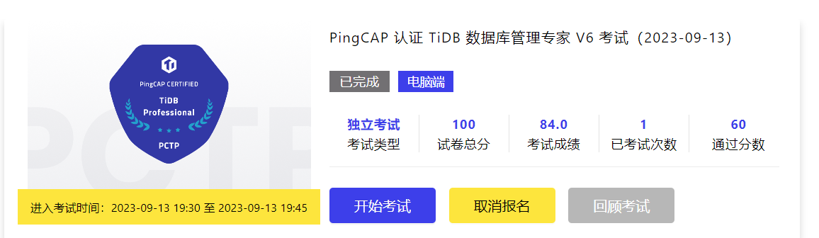 今日考试(2023.09.13 19:30),希望逢考必过,路过的给加加油。后面DBA路还很长,慢慢来,多学一点,多个技能。(Oracle+Tidb+…)