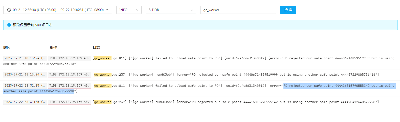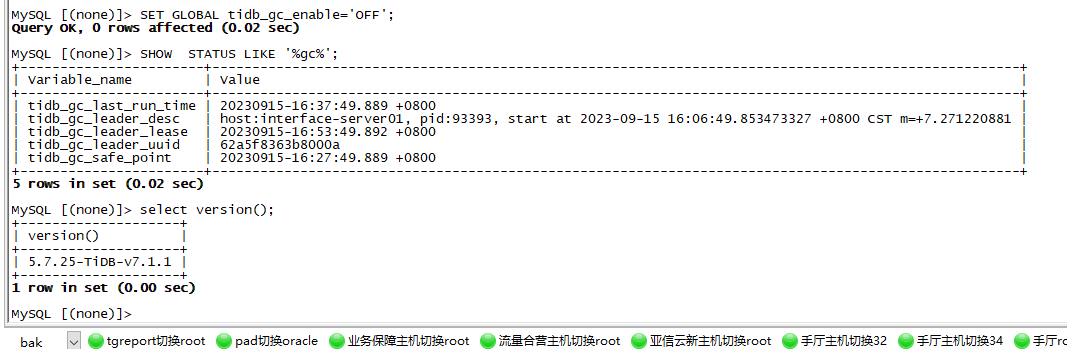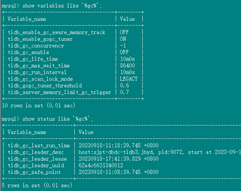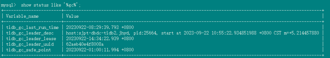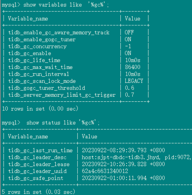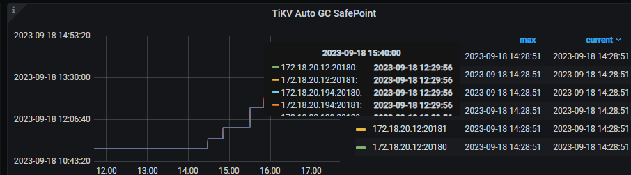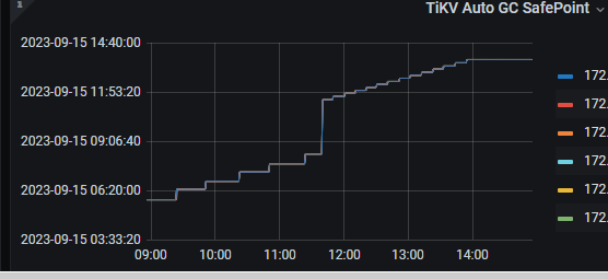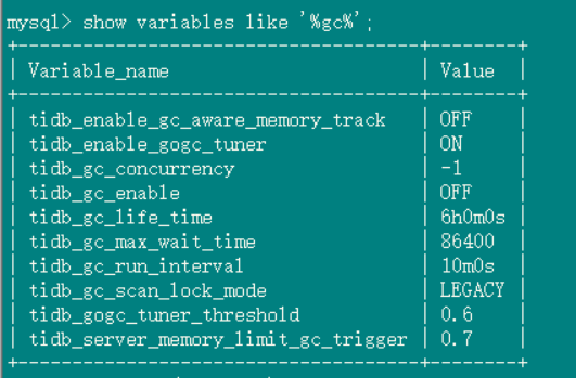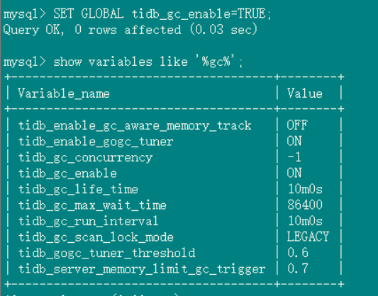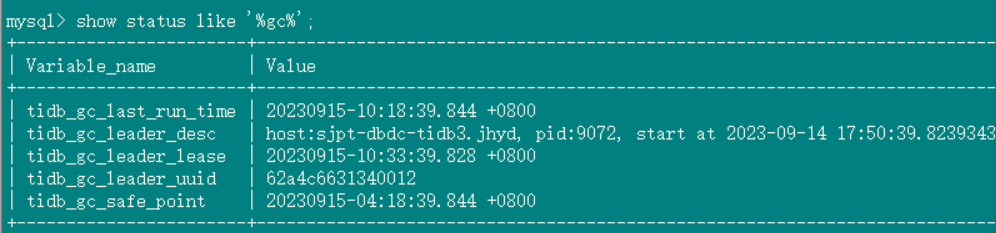 2、tidb_gc_life_time=10m0s , tidb_gc_run_interval =10m0s 打开gc,grafana上面的safepoint和tidb里面查到的很快就一致了