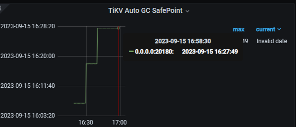 我查了下 granafa中的safepoint是从promethues监控中获取的。如果可以复现,尝试打开 http://kvip:20180/metrics 这个监控数据中有个tikv_gcworker_autogc_safe_point ,看下这个时间是否在推进,如果tidb_gc_safe_point 不变而监控中的tikv_gcworker_autogc_safe_point 持续推进,那这个就是个bug。