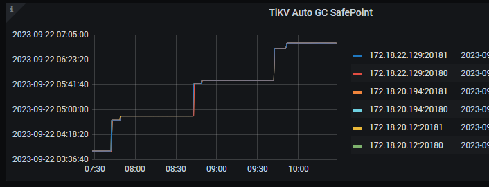 1、tidb_gc_life_time=6h0m0s , tidb_gc_run_interval =10m0s 并且gc关闭,grafana上面的safepoint和tidb里面查到的不一致 ----与6.1.0,状况一样;